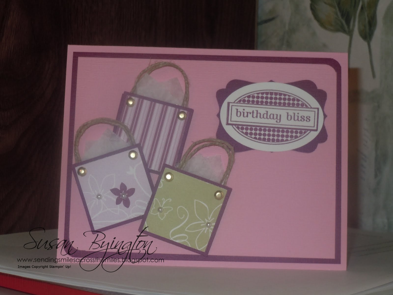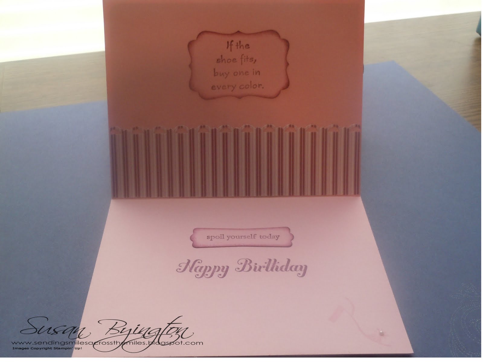 This is a fun birthday card for someone who loves to shop! It’s a slightly modified version of one I did previously in my Cards From Scraps Class. I spiced it up a little here with brads, pearls and an additional layer behind the “Birthday Bliss”. The layers of Pretty in Pink and Rich Razzleberry are textured to help create interest. Also, the simple use of a corner punch created some subtle touches. The inside was so much fun I just had to share that also! The stamp image on the top is from a long since retired set, and the Designer Paper is edged with the Scallop Trim Border Punch, although it’s kind of hard to see in the picture. It’s pretty obvious I love to use my punches, too! If you look closely, there is a ladies shoe with a pearl in the toe at the bottom right of the card (also part of the retired set). One final touch to make the inside as special as the outside.