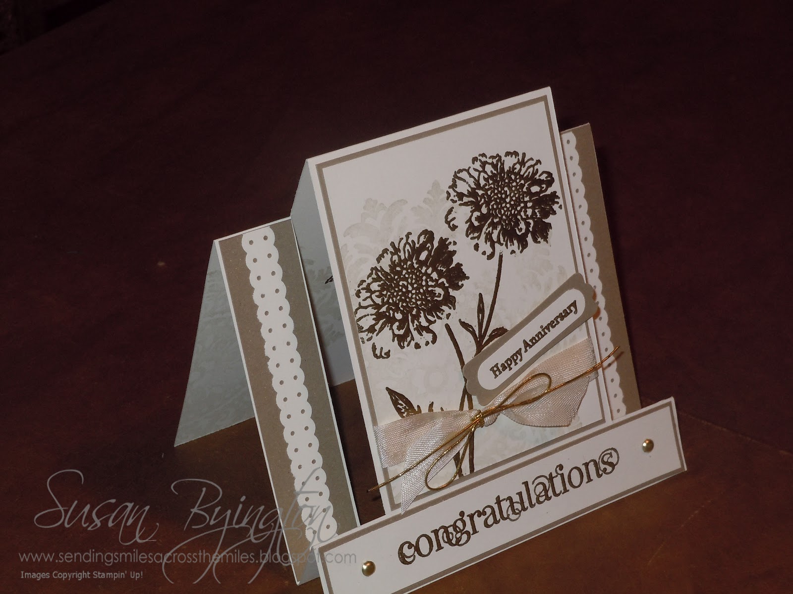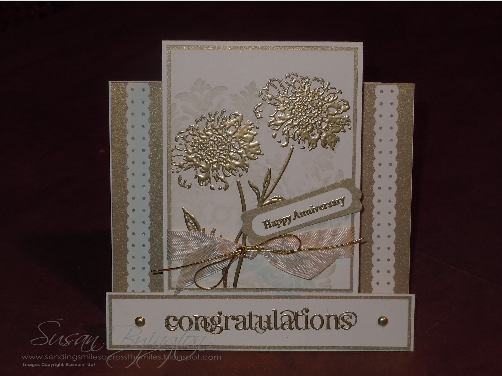 So, here’s one of my favorites . . . it’s a step card made with the Field Flowers stamp set and the recently retired Medallion stamp. I found the basic idea out there in cyber world and tweaked it until it worked for me. I will show you two different angles so you get the full impact of this lovely card. This card was a special request for a golden anniversary. Hope you like it!