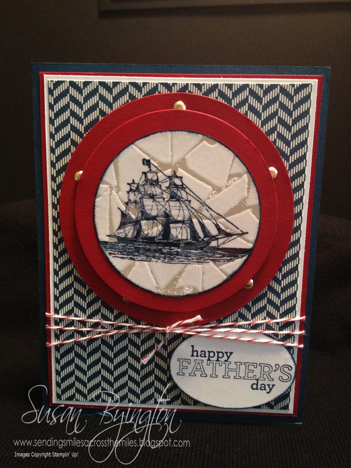 This is the Father’s Day card I gave to my dad this year. Again, I found this idea in cyber world on Dawn Olchefske’s site. I loved the idea of creating a porthole. My card turned out very different from hers, as I used the new Comfort Cafe DSP, Cherry Cobbler, Whisper White and Midnight Muse cardstock. The stamp sets were The Open Sea and Delightful Dozen.