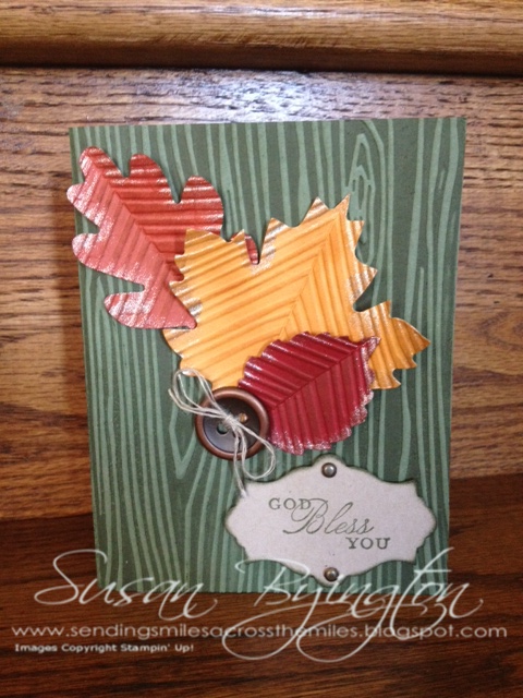 This lovely fall card was made using the new Woodgrain Embossing Folder both on the background and on the leaves, which were cut out with the Autumn Accents Bigz Die. I inked up the Woodgrain Embossing Folder with Always Artichoke Ink to create the unique two-toned look. I love the classic fall colors with a splash of bling, using Champagne Mist Shimmer Paint. Please leave a comment and let me know what you think.