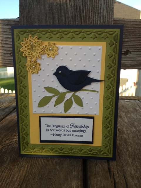 This card was made by Judy Besancenez, another member of my Friday night Stamp Club. Judy has been stamping with us for about a year and a half now. When she joined, she had never stamped before and now is creating absolutely beautiful art work! Punches and the Big Shot are her favorite tools and she certainly makes great use of them.
