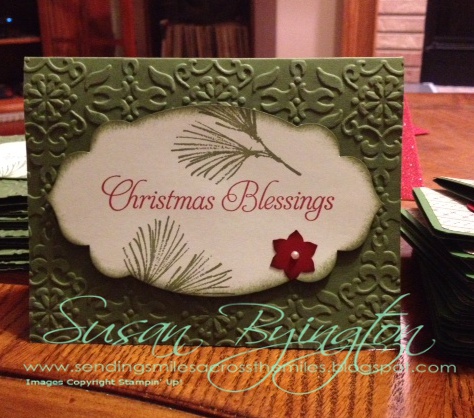 This card is one I created for the card sale at church. The greeting is a non-Stampin’ Up! greeting, but everything else is Stampin’ Up! product. The card base is embossed with the Lacy Brocade Embossing Folder (127819) and the greeting has been cut out with the Apothecary Accents Framelits (127003). The lovely branches come from the Watercolor Winter Stamp Set (129727 Clear). The little accent flower is from the Boho Blossoms Punch (119858), dotted in the center with a tiny Basic Pearl (119247). Dimensionals pop up the greeting. Sponging ink around the edges always creates interest and dimension. Please leave me a comment and let me know what you think.