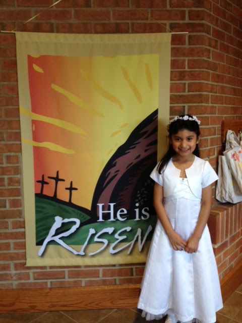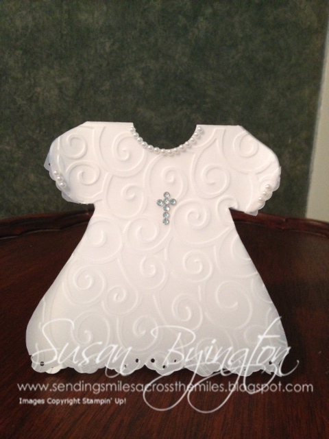 I just love how sweet this first communion card turned out! I made it specially for my niece on her special day. I used the basic pattern I found from Lynn Pratt at www.stampndesign.blogspot.com. Having difficulty cutting the little scallops, I just rounded off the sleeves and cut the front longer and straight across. Then I used Stampin’ Up! retired Eyelet Border Punch for the bottom edge and the Dotted Scallop Ribbon Border punch for the sleeves. I just cut the punched piece neatly in half between the dots to create the simple scallop edge on the sleeves. I used vellum to cut the sleeve scallop and vellum adhered to the entire front of the dress before I ran the front through my big shot using a non-SU embossing folder. I couldn’t get the SU folder I wanted to use to lay just right to create the pattern I was going for on the dress, so since I was in a hurry (we had to leave in a half-hour and I still had to get ready!), I opted to use this simple scroll pattern all over the front of the dress. The pearls on the neckline and sleeves are from Stampin’ Up! as are the rhinestones that form the cross.