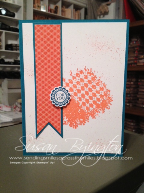 Here is a quick and easy card created with the Clockworks stamp set and the new A Round Array stamp set and punch. The colors in this project are Island Indigo, Tangerine Tango, and Whisper White. The Designer Series Paper is from Summer Smooches. The soft spatters of color are made using a Tangerine Tango marker and the Color Spritzer Tool.