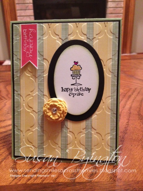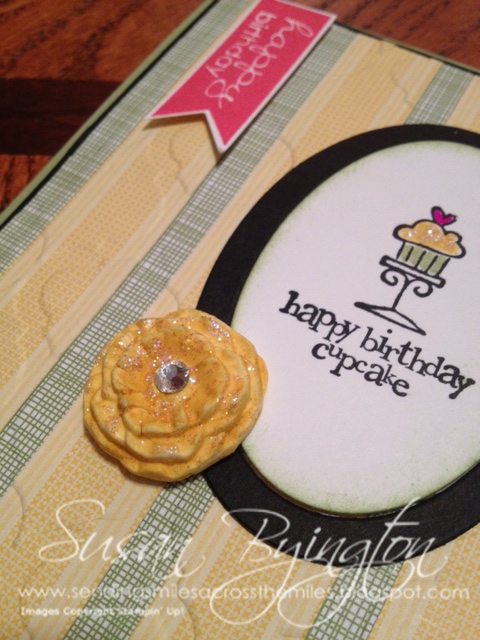 Here is a sneak peek into some of the upcoming products in the new 2013-2014 catalog. This is the birthday card I made for my daughter using several brand new items. It has a fun feel to it, while being just classy enough. I layered strips of DSP together, then ran it through the Big Shot with the new Modern Mosaic Embossing Folder for some great texture; and I also used the DSP for the inside to give it more pop! The adorable flower was made using the new Simply Pressed Clay & Mold from the new catalog, and I just colored it with a Daffodil Delight Marker. Sooooo simple! It’s so fun and easy to make your own bling and color it to match with this new product! I absolutely LOVE it!!!