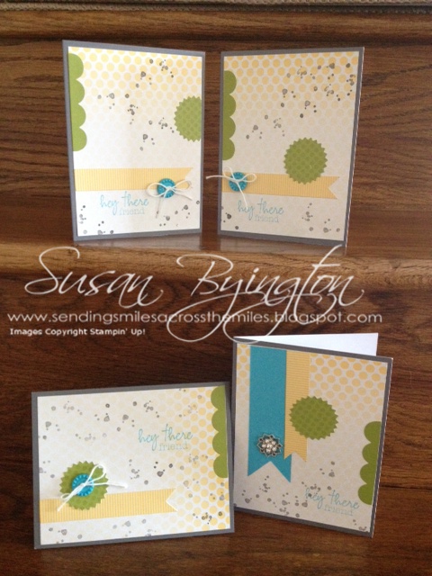 Paper Pumpkin is like a mini class delivered right to your door. The projects are fun and simple–everything is included; all you need is adhesive. Everything is cut and scored for you, so all you do is assemble. Special elements are die cut on sticker sheets so you can just peel and stick. You can follow the directions exactly or mix it up and create your own. Here is a sample of the first kit you will receive–it even comes with the clear block! I purposely created 4 different cards than the suggested pattern. I spiced things up just a pinch by using Tempting Turquoise ink to stamp the greeting since it matched the buttons in the kit. Then I added a small piece of Baker’s Twine in the buttons tied into a bow. On one card I did not use the included button, but instead used one of the Frosted Finishes Embellishments on page 28 of the Holiday Catalog (132150). They are absolutely fabulous!!!