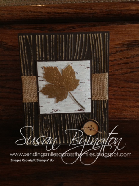 This is a great fall card that is quick and easy. It also works beautifully for a masculine card! I layered Early Espresso Core’dinations CS on to Early Espresso CS for a more 3-D effect, Before adhering the two, I ran the Core’dinations CS through the Woodgrain embossing folder, then sanded the surface lightly. This makes such a great rustic look. Sticky Strip holds the Burlap Ribbon in place on the back.