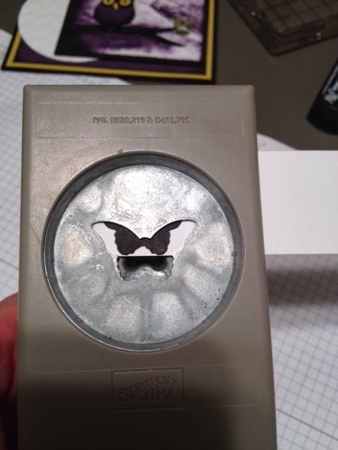 To make the bat I used the Bitty Butterfly Punch. I punched the butterfly out of Basic Black card stock and lightly adhered it to the edge of a scrap of Whisper White card stock. You want to use a lighter color of card stock so you can clearly see where to punch the second time.
