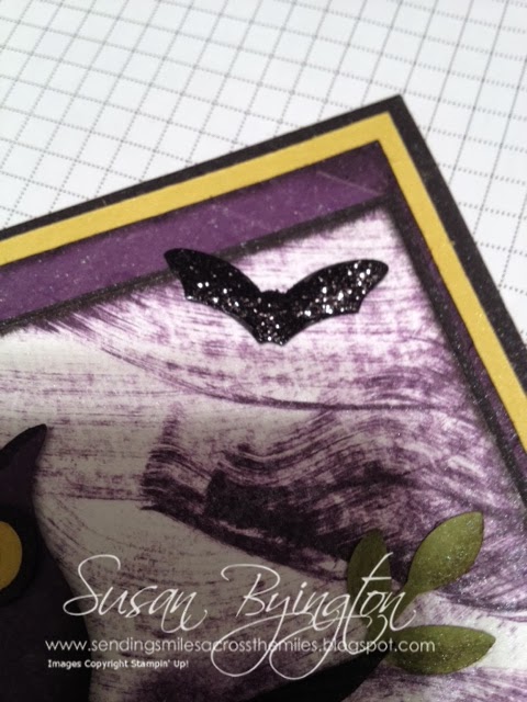 I didn’t feel the bat had quite enough pop, so I then covered the bat with Crystal Effects and lightly sprinkled Black Stampin’ Glitter into the wet Crystal Effects. Be sure to give the Crystal Effects plenty of time to dry. This is the result. I added him to the edge of the card with a double layer of glue dots to make him pop up just a bit. The Crystal Effects gave him a nice dimension that had the appearance of a puffy sticker!