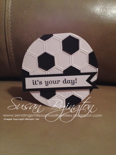 This is another birthday card I made for my nephew. I thought a fun shaped soccer ball card would be perfect for him. For this card I used the 3 1/2″ Bigz Die to cut out the shape, then ran it through the Honeycomb Embossing Folder with the Big Shot. I ran a Basic Black piece of card stock through the same folder and cut out some of the hexagon shapes to create the soccer ball effect. The sentiment is from retired stamp set Happiest Birthday Wishes.