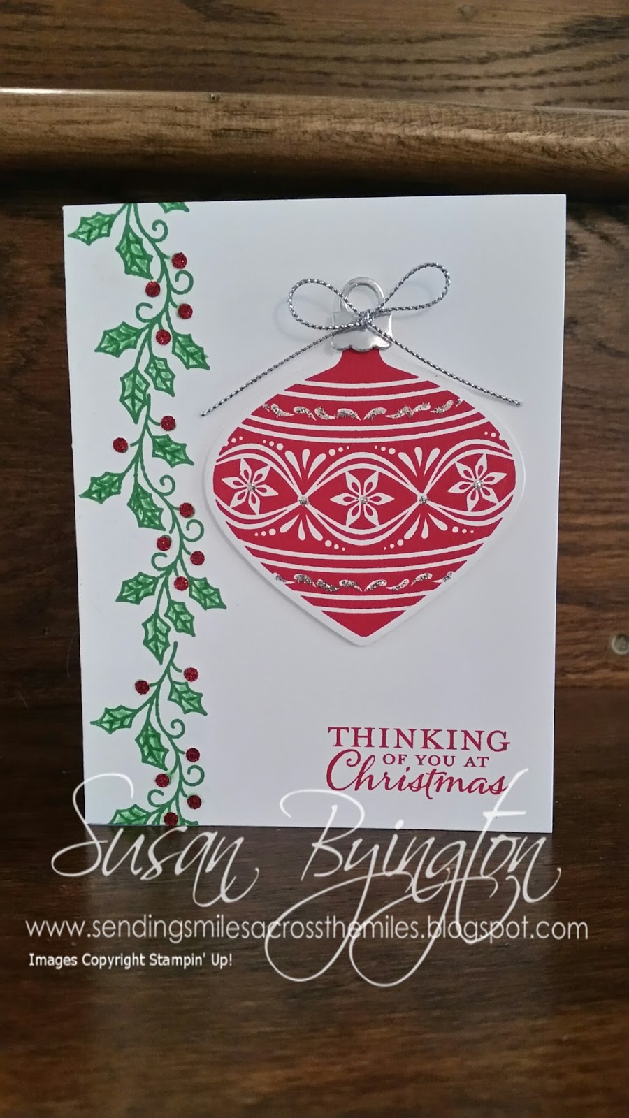 This is a lovely card that is crisp and bold with its traditional Christmas colors. I used the Embellished Ornaments stamp set and the matching Delicate Ornament Thinlits Dies with Whisper White Thick Cardstock as the base. This cardstock is so fabulous when you want a simple white card base! It holds up very nicely and the ink does not show through the other side–not even this bold Real Red. The finish on this paper produces a beautifully stamped image as well. A few dabs of glue from the Fine Tip Glue Pen and some Silver Glitter make the ornament sparkle. A Silver Foil top and Silver Cording Trim top it off. Using a Blender Pen, I lightly colored in the leaves that were lined up using the Stamp-A-Ma-Jig. The berries are Red Glimmer Paper pieces that I made with the 1/8″ Hole Punch and glued on with a tiny dot from the Fine Tip Glue Pen. I popped the ornament up with Dimensionals.