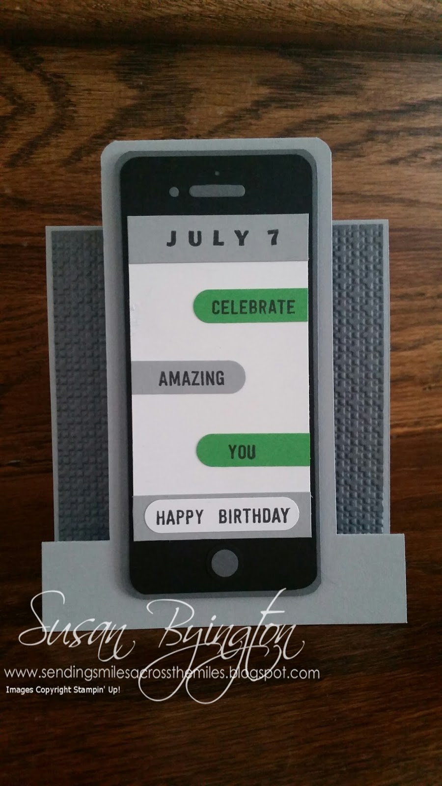 Happy 18th birthday to my nephew, Keaton! This is the fun center step card I made for him. It’s an iPhone! Thank you to Amanda Bates at The Craft Spa who inspired me to make this adorable card! You can see her original card here. You can see I didn’t change much! I really like how it turned out! I used the Thoughtful Banners stamp set for the sentiments and some retired items for the date at the top and the text bubbles.