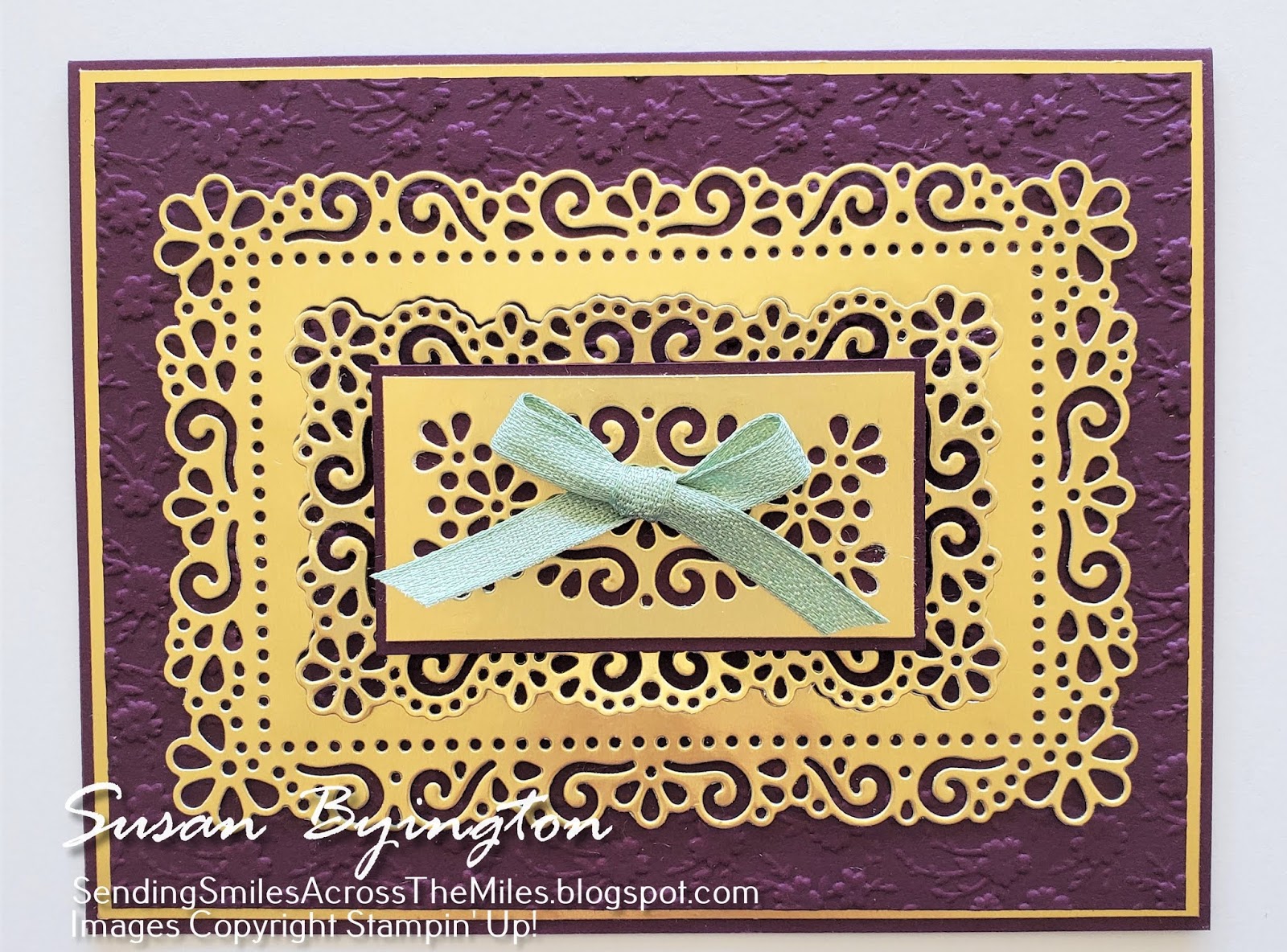 This stunning card was made using Blackberry Bliss cardstock and Gold Foil paper. The dies are part of the new Ornate Garden Suite that can be purchased now as an early release product. Order your products now because there’s a good chance they will go into backorder status soon after the release of the 2020-2021 Annual Catalog. To get the complete suite of products for $136.75 use item #154153.